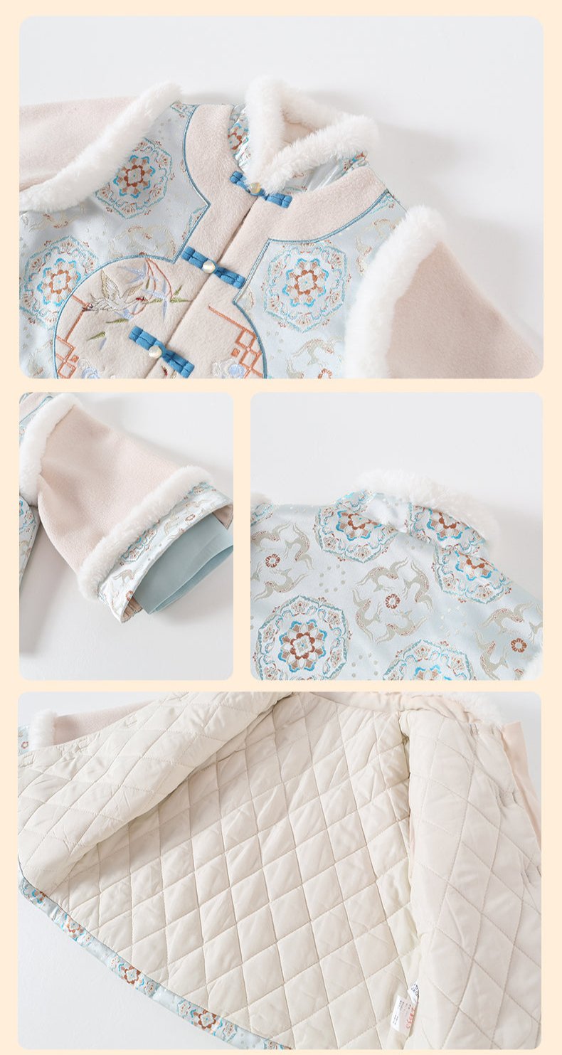 ntroduce timeless elegance to your child's wardrobe with this beautifully designed traditional-style winter jacket. Featuring a luxurious combination of soft pastel tones and intricate embroidery, this jacket captures the essence of Chinese cultural heritage with a modern twist.