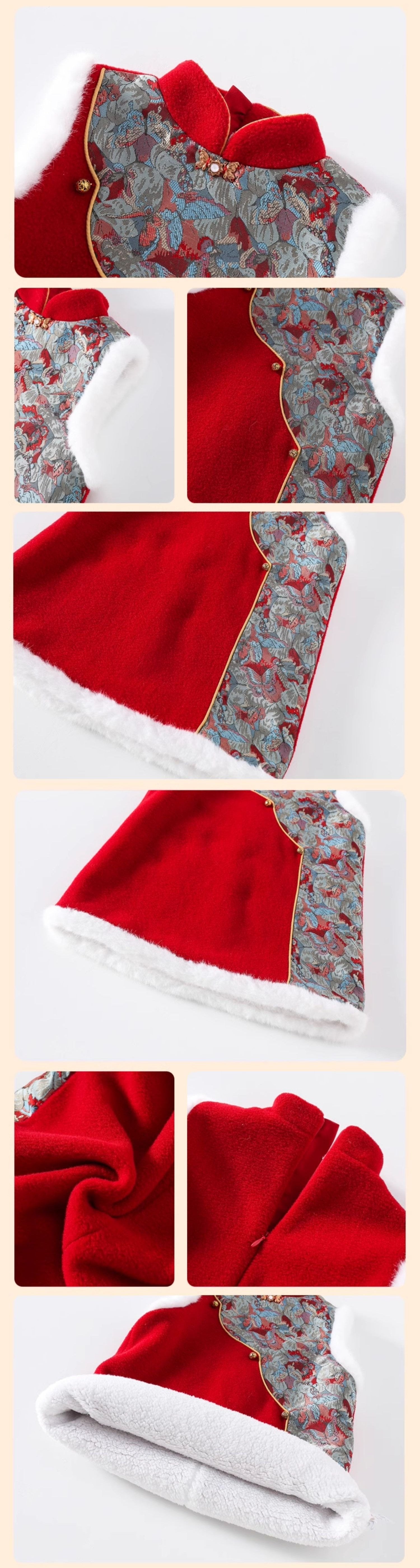 Celebrate the festive spirit with this Velvet Embroidered Chinese New Year Dress for girls. Crafted with soft velvet fabric and accented with intricate floral brocade embroidery, this sleeveless cheongsam-style dress combines traditional elegance with modern comfort. The asymmetrical design, mandarin collar, and fur-lined edges provide a touch of sophistication and warmth, perfect for winter celebrations. Easy to wear with a hidden zipper closure, this dress is ideal for Chinese New Year parties, photoshoots, or any special occasion. Let your little one shine in this charming and culturally inspired outfit!