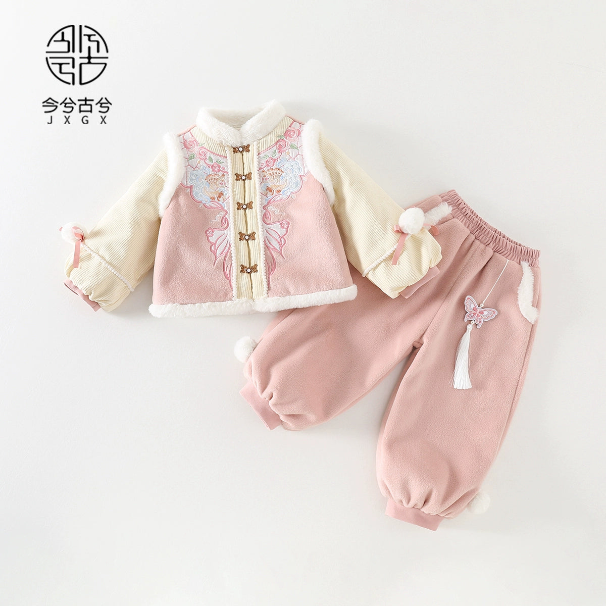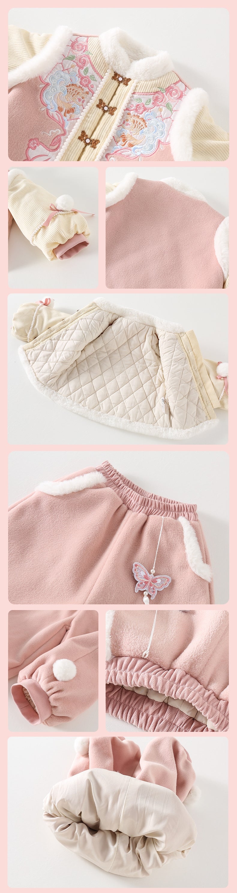 - Pants: Matching pink trousers with a decorative butterfly tassel and elastic cuffs for a secure fit.