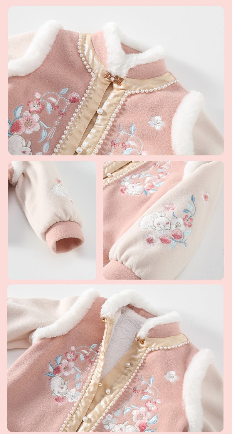 Adorable Jacket: A pastel pink jacket with intricate bunny and floral embroidery, accented by pearl-like buttons and soft faux fur trim for a cozy yet refined look.