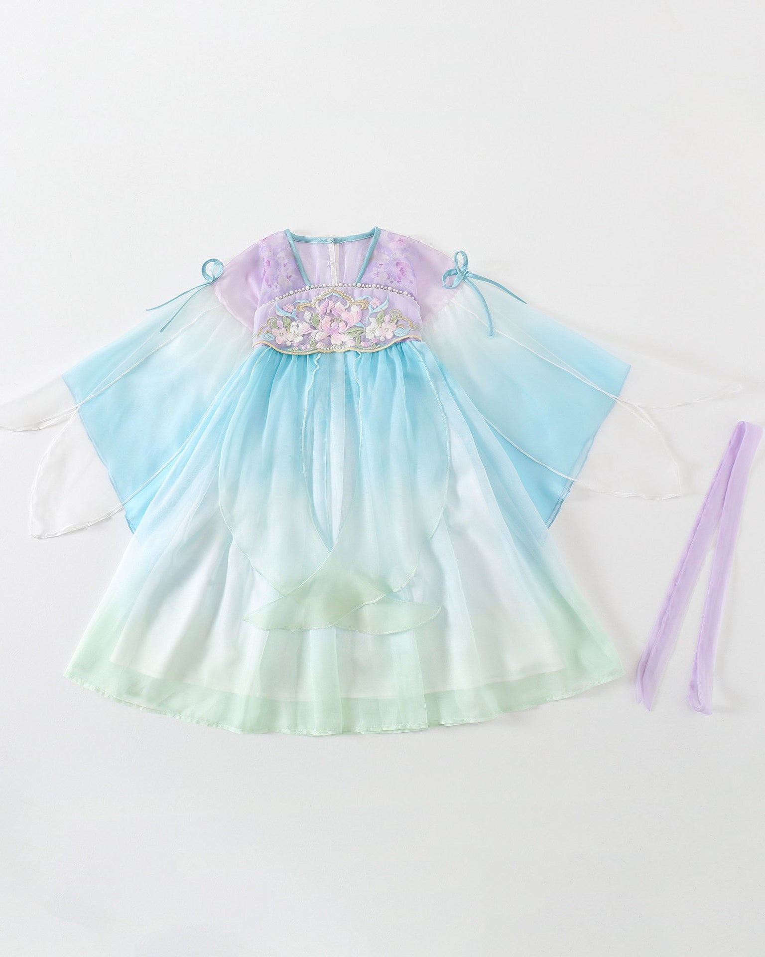 This enchanting Hanfu-inspired dress features a delicate blend of soft lavender and sky blue tones, creating a dreamy, fairy-like look perfect for little girls who love elegance and imagination.
