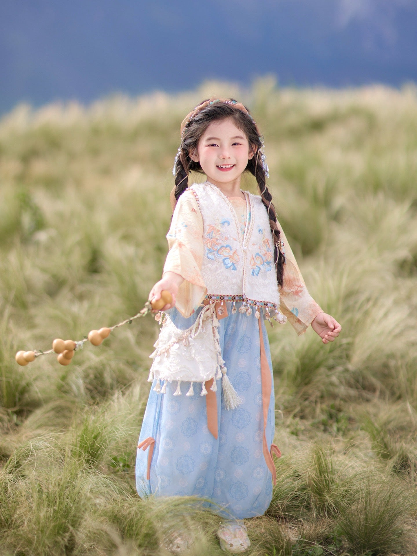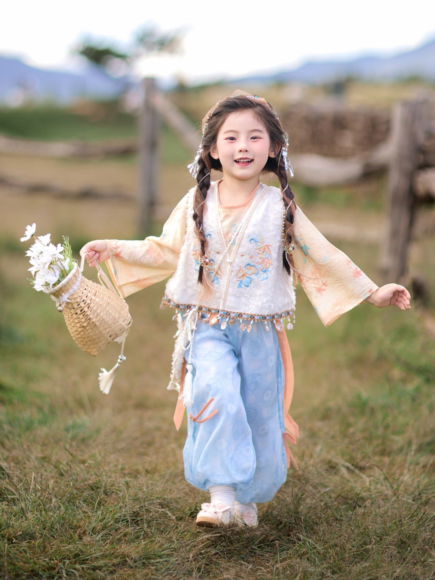 This beautiful girl’s outfit features a delicate, traditional-inspired top with intricate embroidery and charming pom-pom details, complemented by comfortable, patterned bloomers. Available in soft pastel colors, this set exudes an elegant, vintage charm perfect for festivals, performances, or special occasions. Made from high-quality, soft materials, it ensures comfort while allowing your child to shine and move freely. This versatile outfit is ideal for creating memorable moments with a timeless, cultural touch.