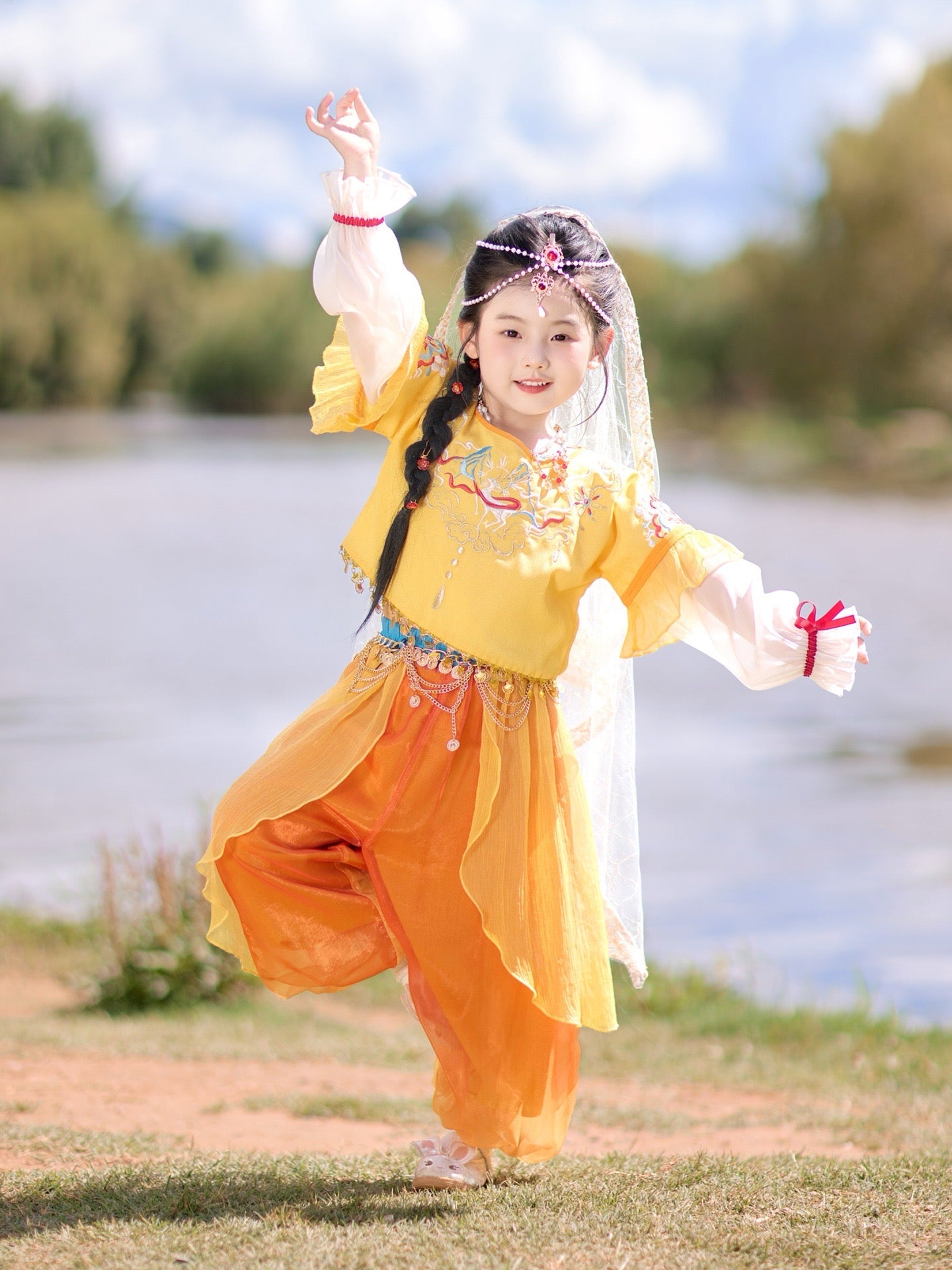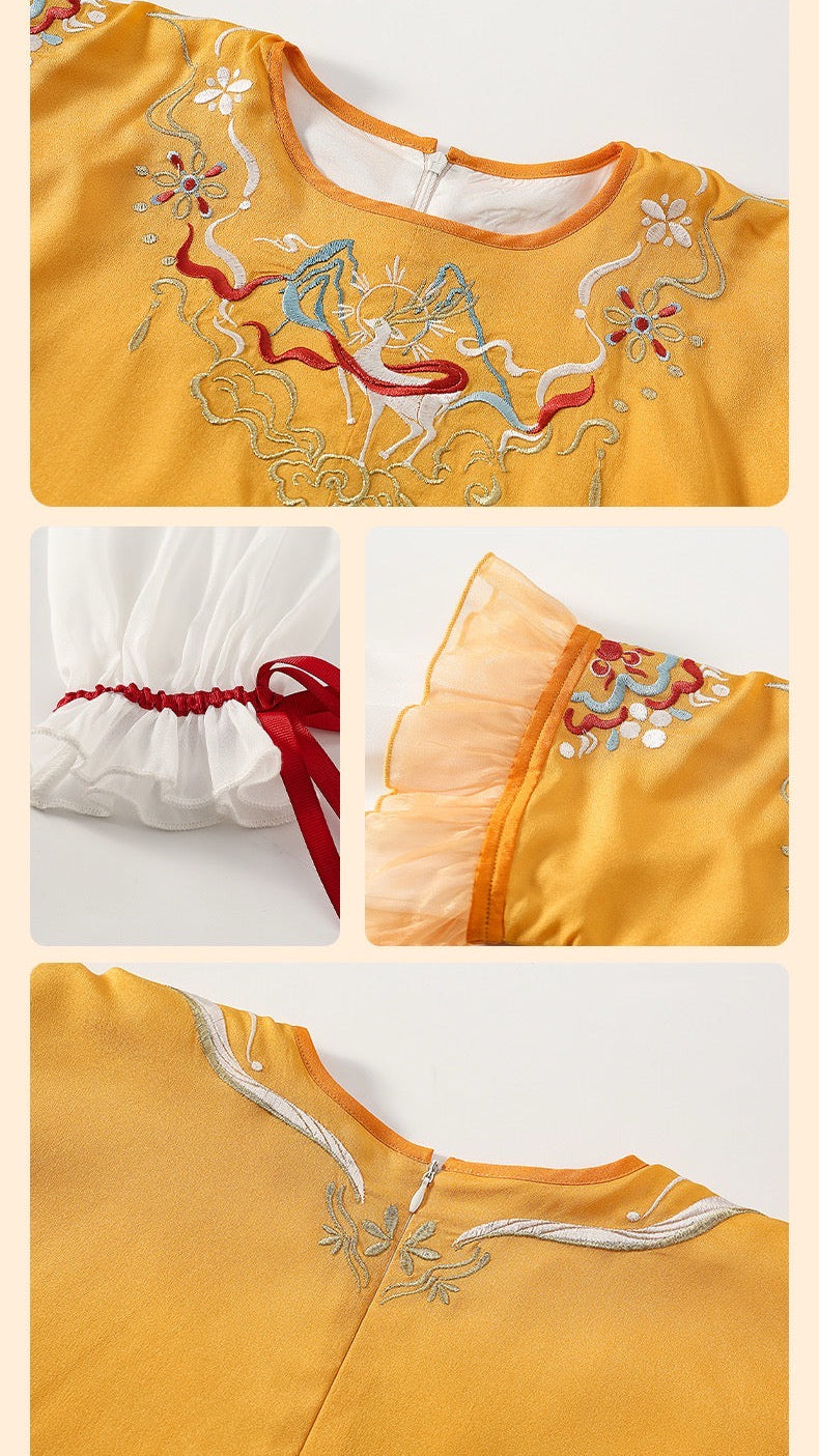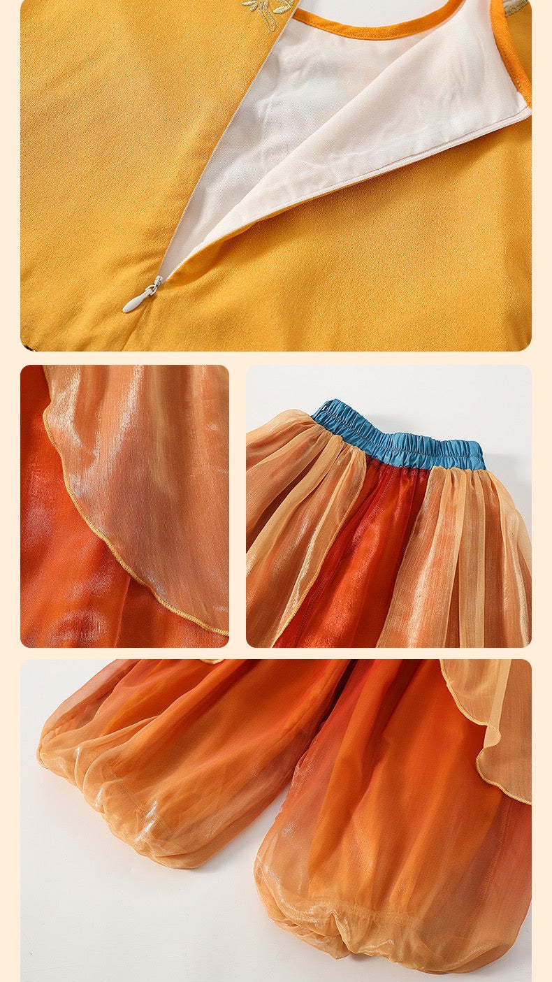 Inspired by the charming legend of the Jade Rabbit, this girls' Hanfu set shines in warm orange and yellow tones. The vibrant color palette is full of youthful energy, perfectly capturing the playful and lively spirit of the beloved lunar princess.