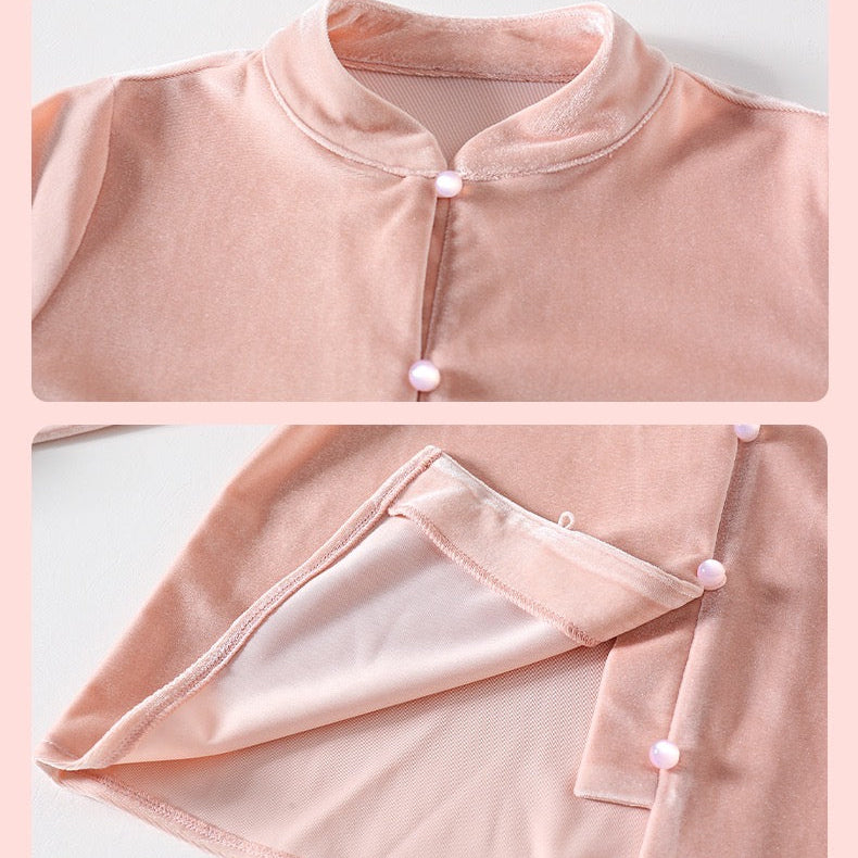 This "[Zhi Xu]" set is a beautiful blend of traditional and modern. Its cheerful pink color scheme feels both youthful and vibrant, while delicate embroidery, prints, and classic frog buttons add an artistic, traditional touch. Crafted from high-quality, comfortable fabric with a soft luster, it's designed to be both warm and practical. From its colors to its overall design, this outfit lets children experience the warmth and elegance of classical culture while wearing Hanfu in fall.