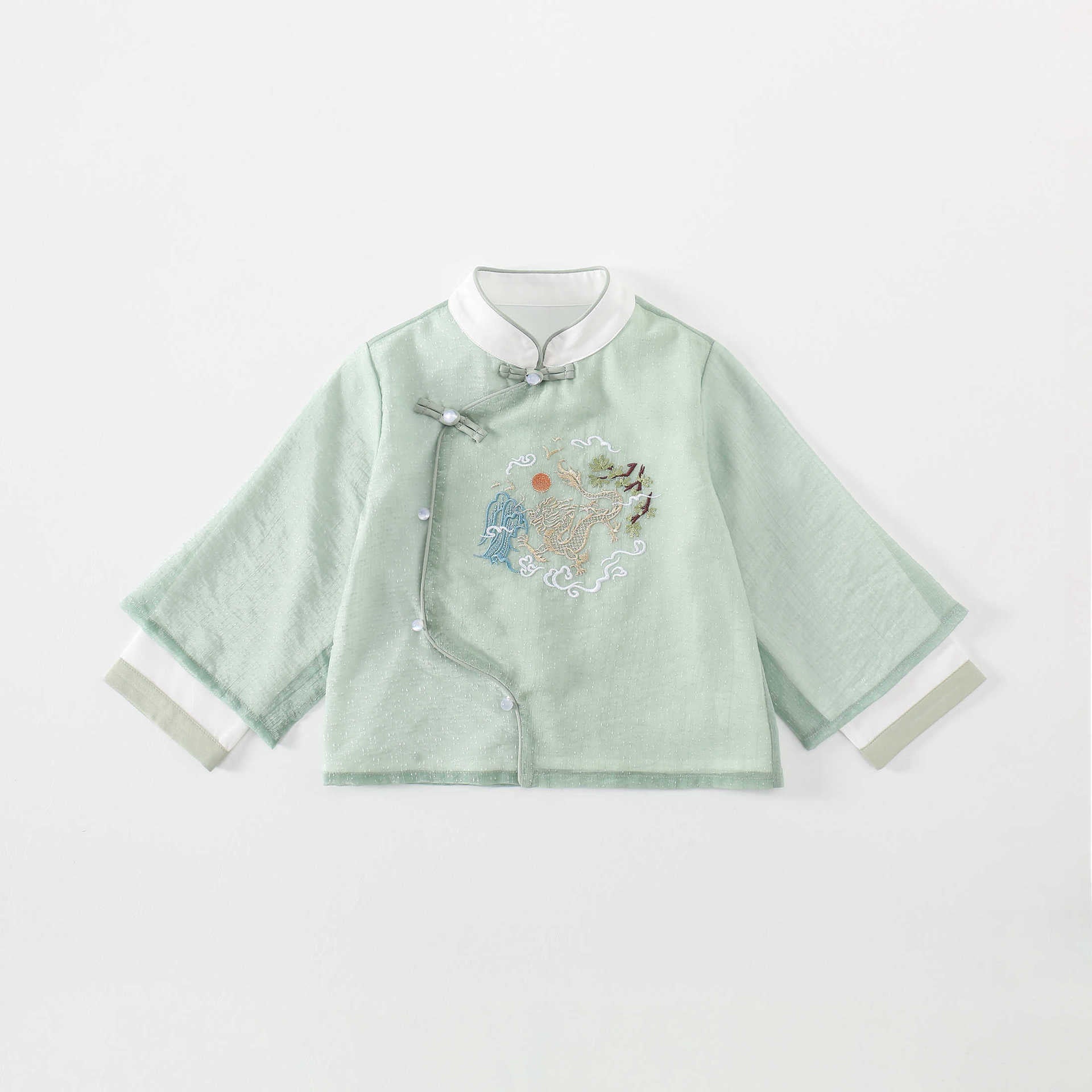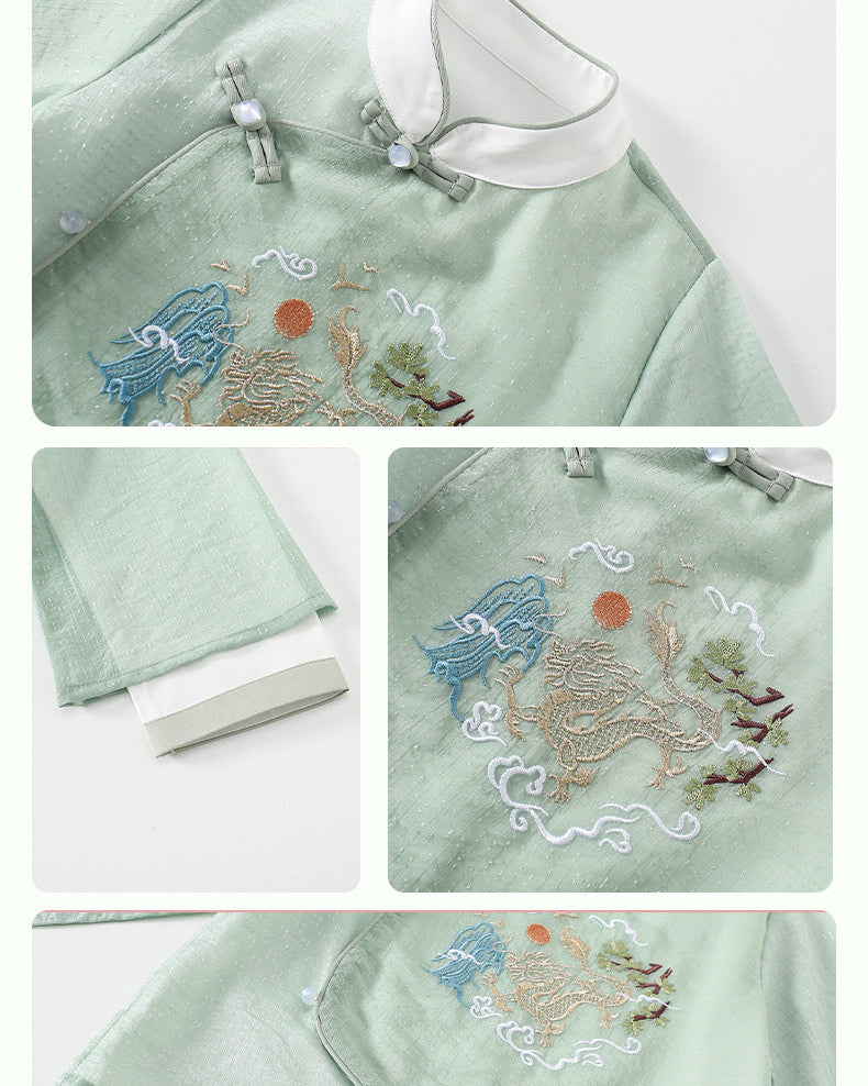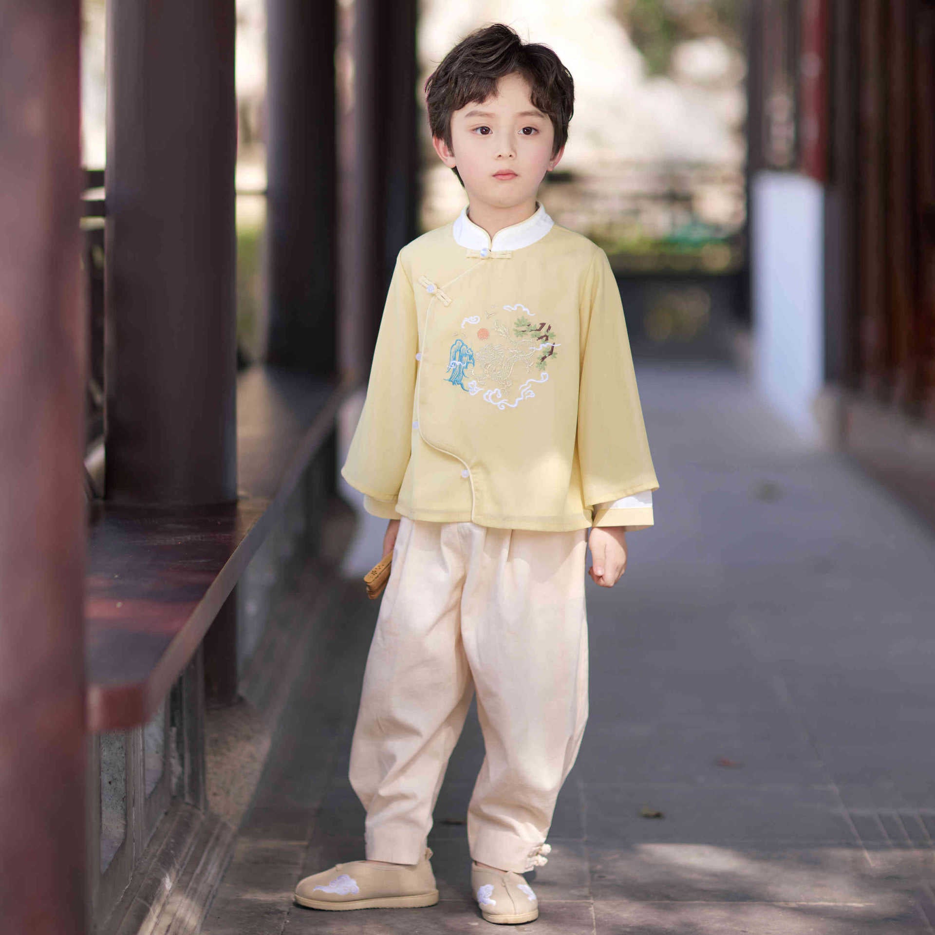 This boys traditional outfit blends classic Chinese design with modern comfort. Featuring a soft cotton Tang-style jacket with delicate dragon embroidery, paired with relaxed-fit pants, this set is perfect for both special occasions and everyday cultural wear.