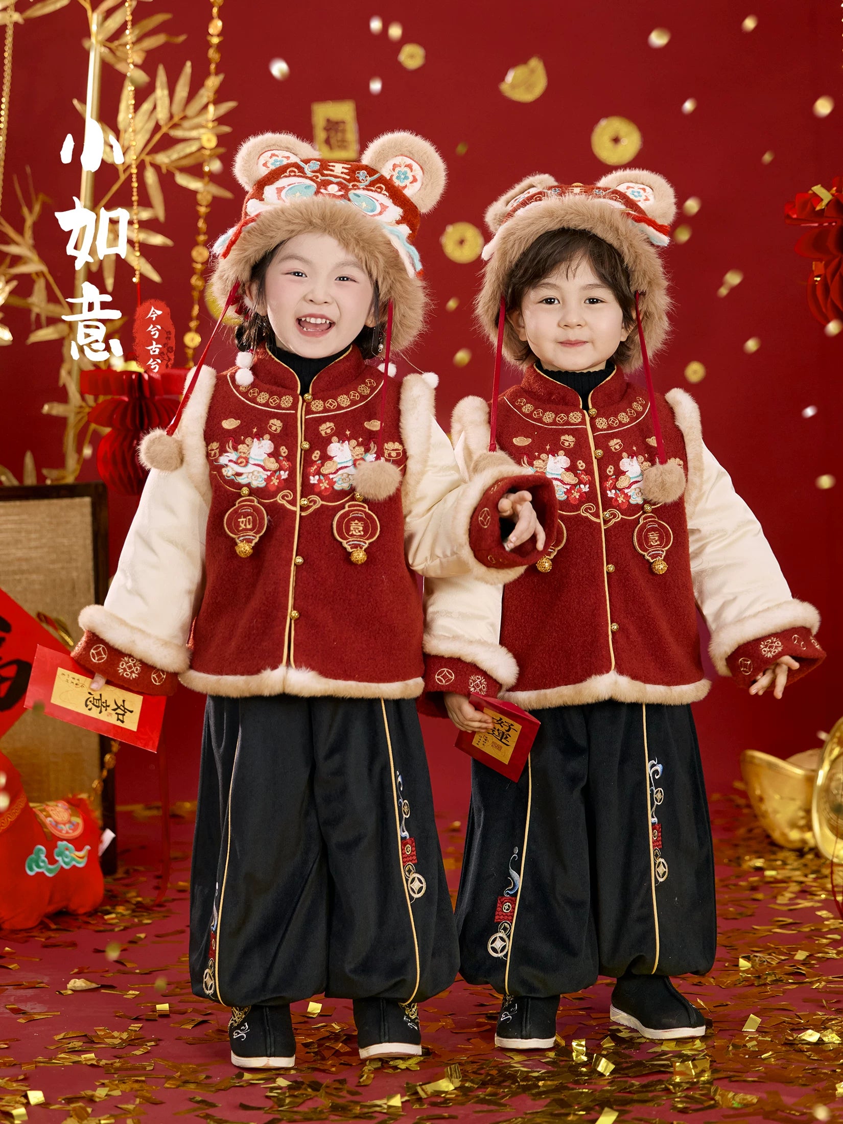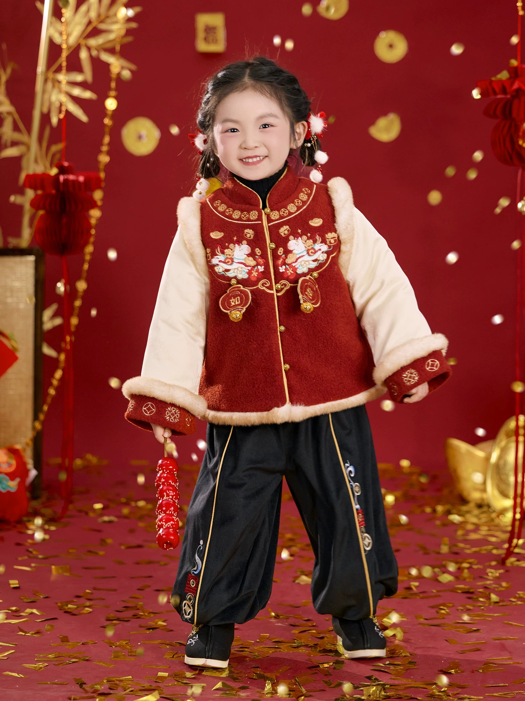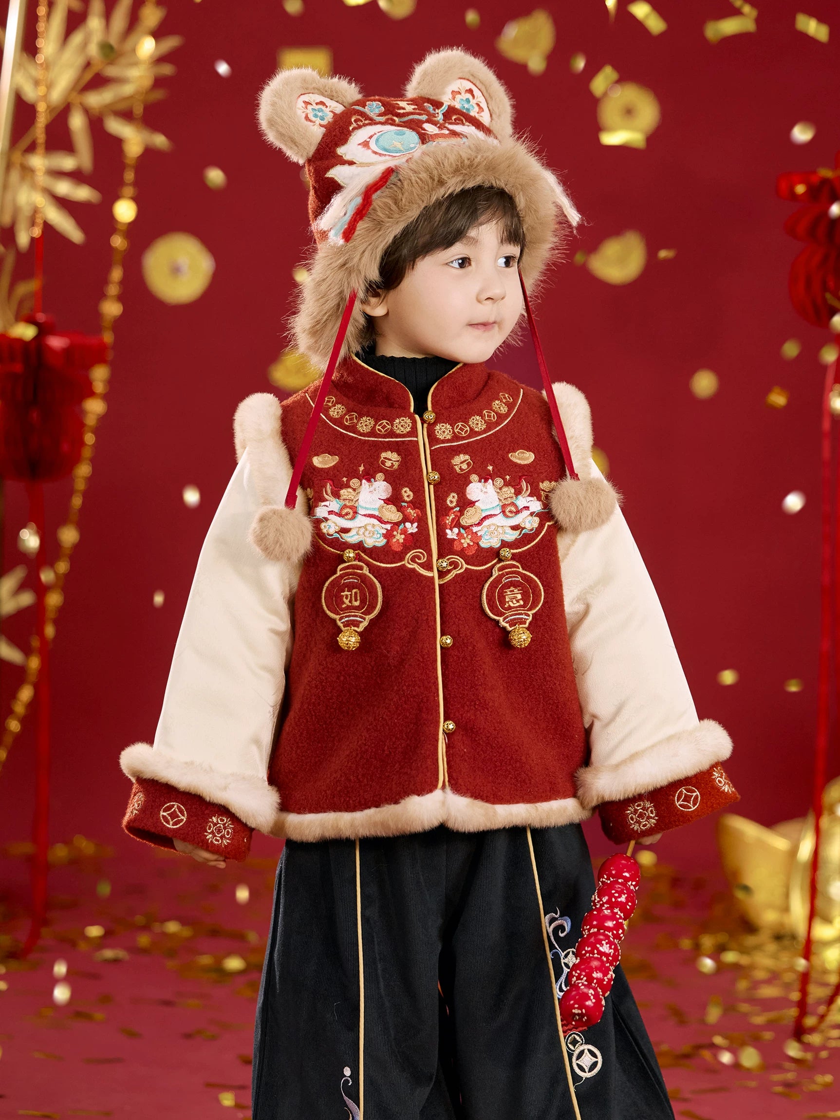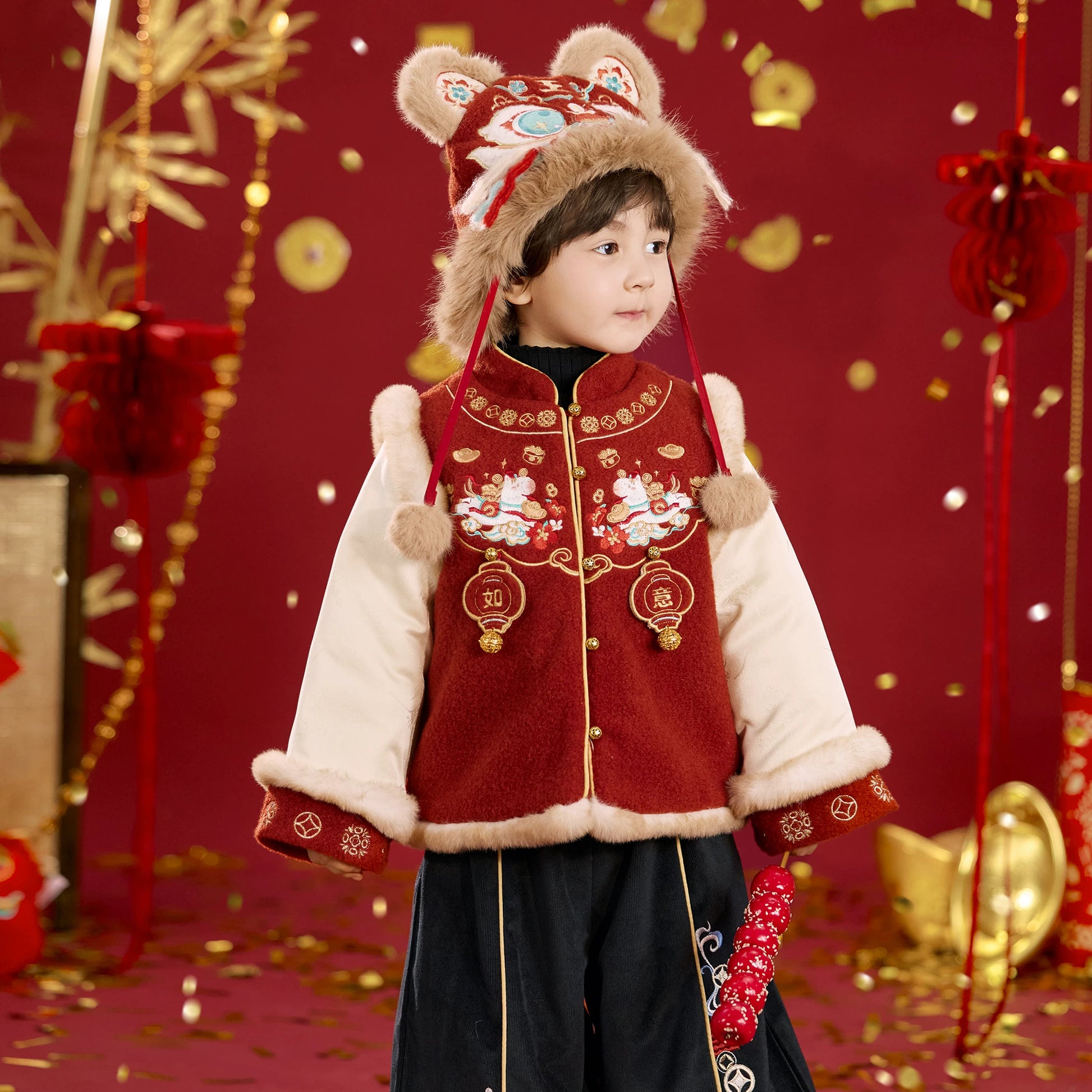 Product Description:Inspire joy and tradition this festive season with the "Little Ruyi" jacket — a modern Hanfu-style coat designed for children to wear with comfort and cultural pride.